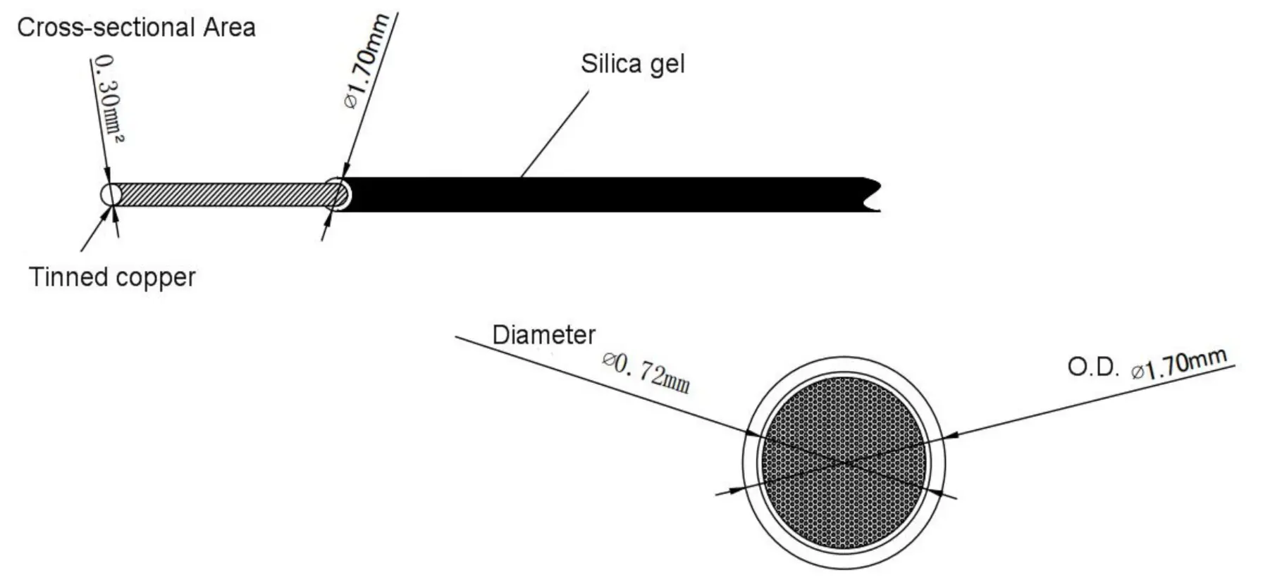Insulation: Silica gel with 0.55 mm wall thickness, giving an overall diameter of about 1.7 mm.